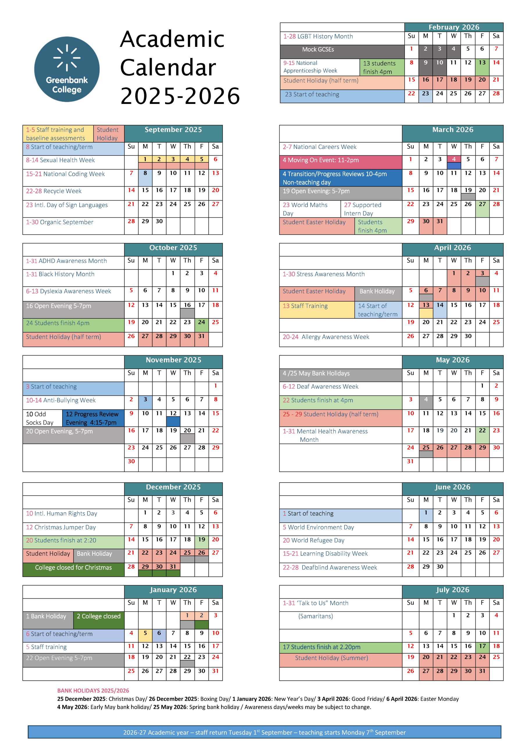 - Christmas break: Monday 22nd December 2025 to Monday 5th January 2026