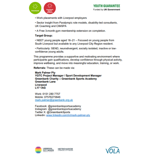 We are delighted to announce that the Greenbank Project and Greenbank Sports Academy have secured funding from the Liverpool City Region Combined Authority UK government Youth Guarantee Trailblazer Programme and VOLA.